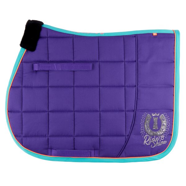 Ride and shine away with this saddlepad. Both binding and piping are made from a contrast color to bright up this style. The logo and quote artwork are made from sequins, glitter stones and even luxury embroidery. At the withers there is a soft fur part to protect the saddlepad from rubbing at the back of the horse. The lining of the complete saddlepad is extra soft. Perfect!